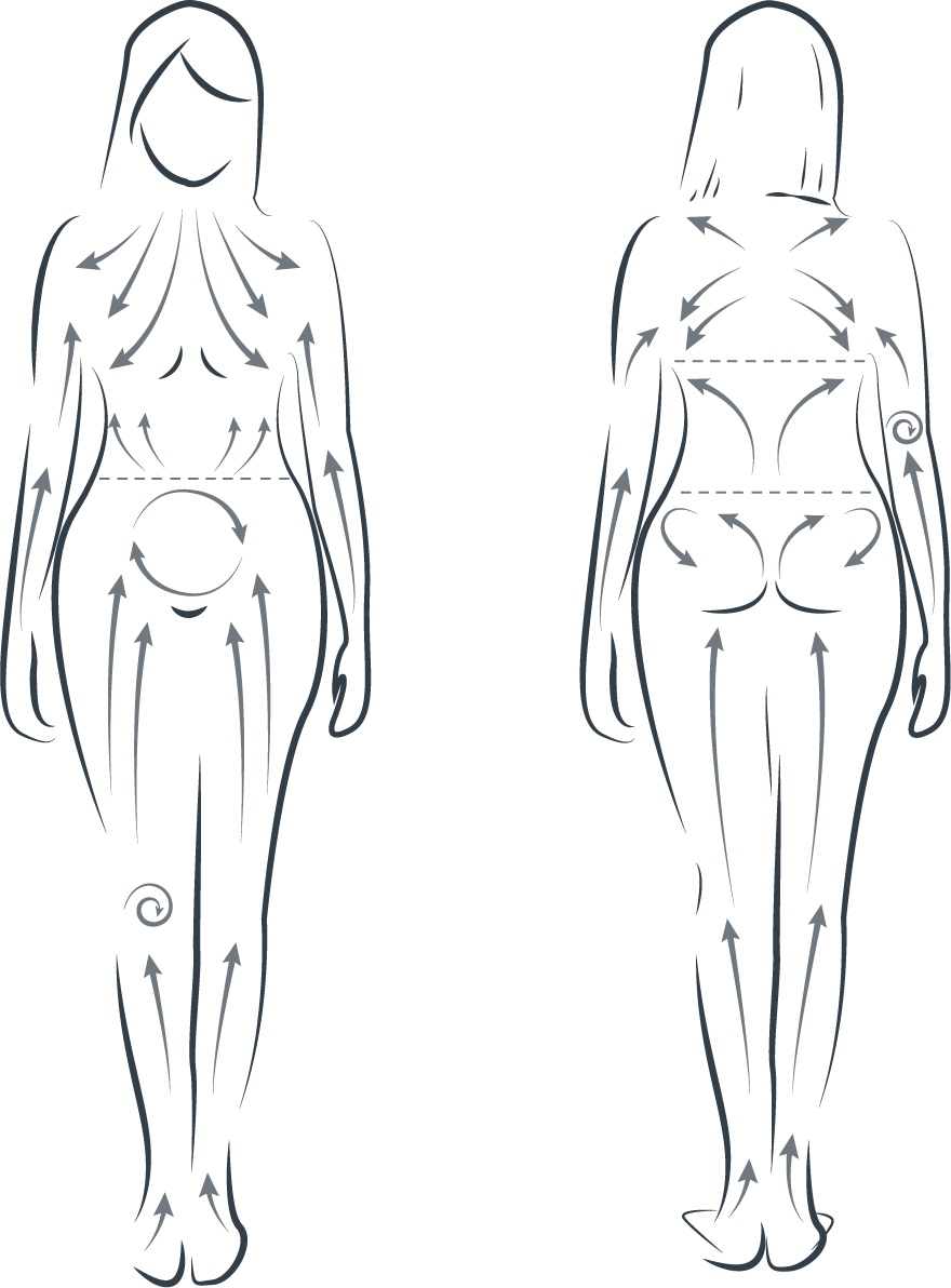 Почніть з ніг і повільних рухів за годинниковою стрілкою до серця. Ноги - працюйте від передньої і задньої частини правої ноги до стегна, а потім до нижньої частини. Руки - починайте з правої руки і рухайтеся на передпліччя, щоб дотягнутися до нижньої і верхньої частини живота. Живіт - масажуйте живіт, починаючи з нижньої правої сторони і рухаючись вгору до ребер.